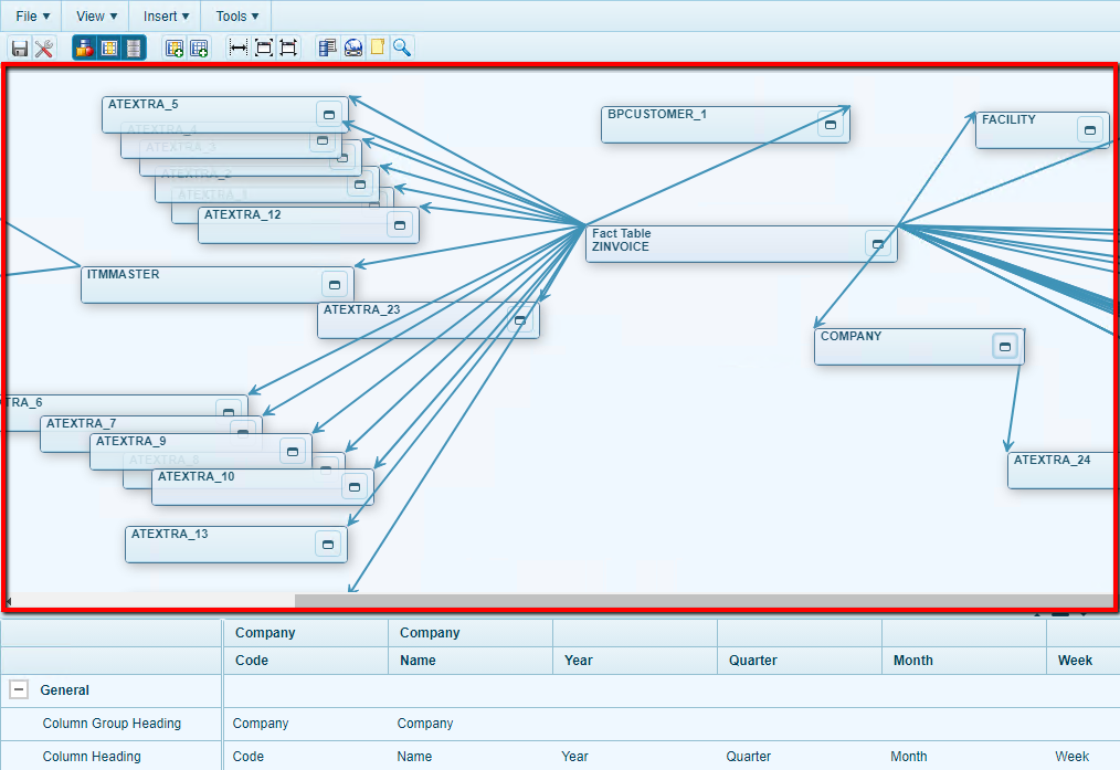 - Design Process: A design process is a SQL arrangement of tables from your data source (EM) that includes two main sections.