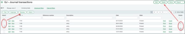 Entries in the General Ledger can be either deleted or reversed from the list of Journal Transactions. Go to General Ledger, All, Journal entries. Beside the appropriate journal, click on View transactions. Select transactions on the left to reverse and select transactions on the right to delete.