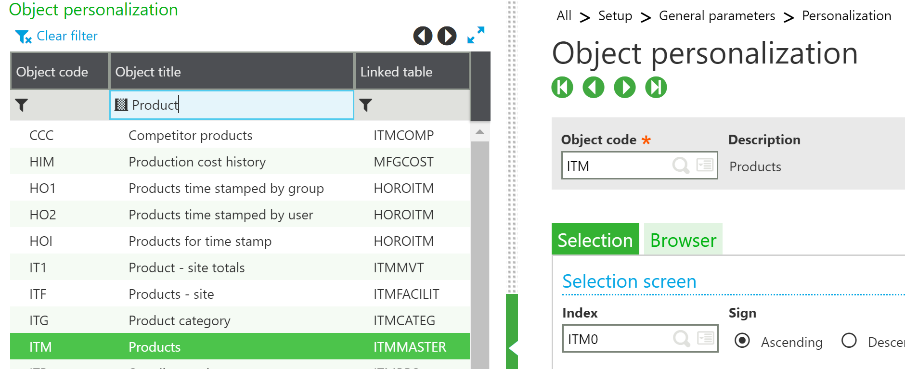 - To begin personalizing the left list follow the path Setup > General Parameters > Personalization > Objects.