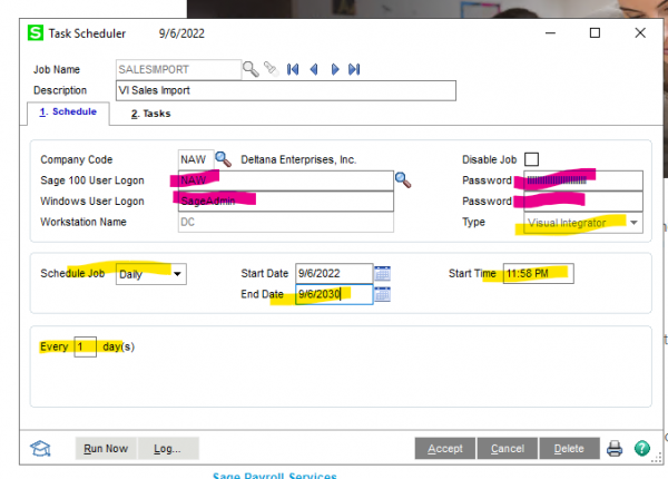 This article will show you how can schedule a Visual Integrator (VI) import or export job to run automatically in Sage 100. For best results, is recommended that the steps below be performed directly on your server, rather than on a workstation.