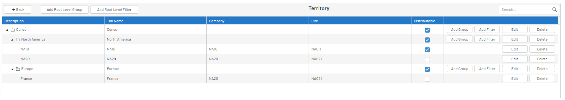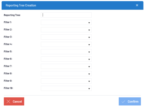 At the group level, the filters you define are gathered on each level from the Root (Root Level Filter) into a group so that the hierarchy stays organized and easy to navigate. It is here that you create the Nodes that will compose your Reporting Tree.