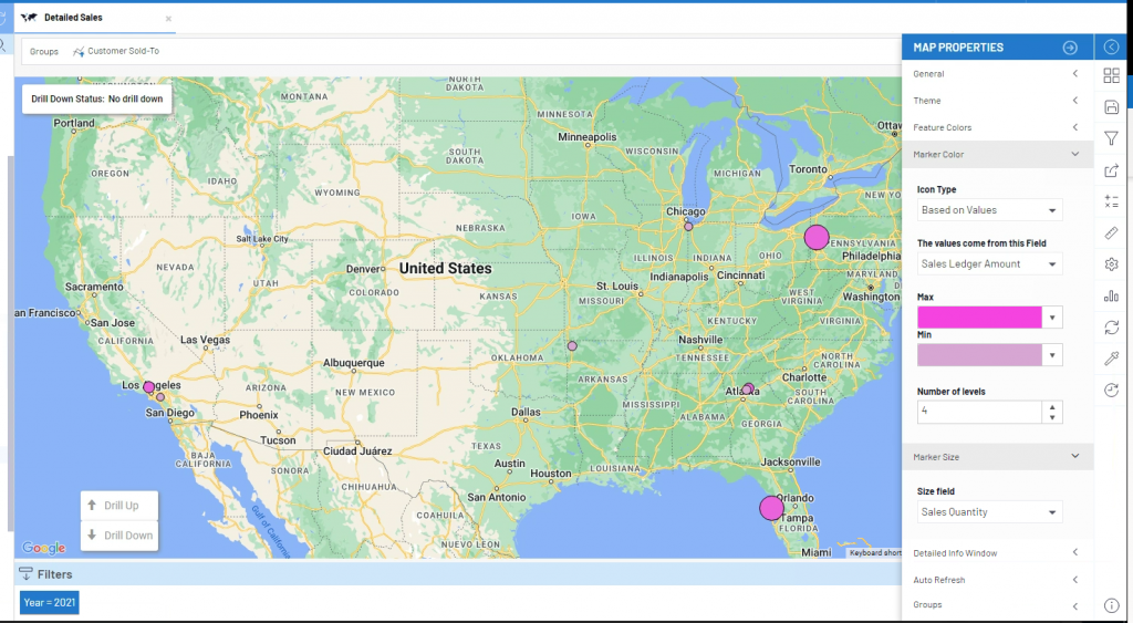 The kinds of markers available can be changed. In this example, the customer markers can have a different color depending on the value of the Sales $ and a different size depending on the sales quantity.