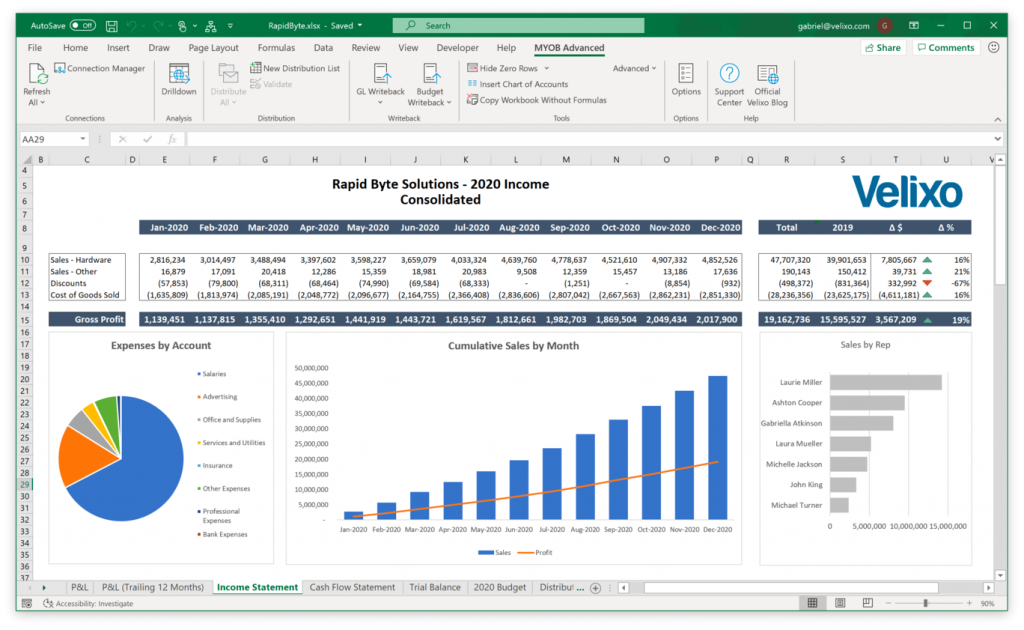 You can make data come to life in Excel. Velixo empowers every Excel user in your organization to quickly and easily build highly accurate and fully drillable reports and dashboards that refresh automatically. It’s simple yet effective execution allows your entire team to benefit, helping your business make better decisions.