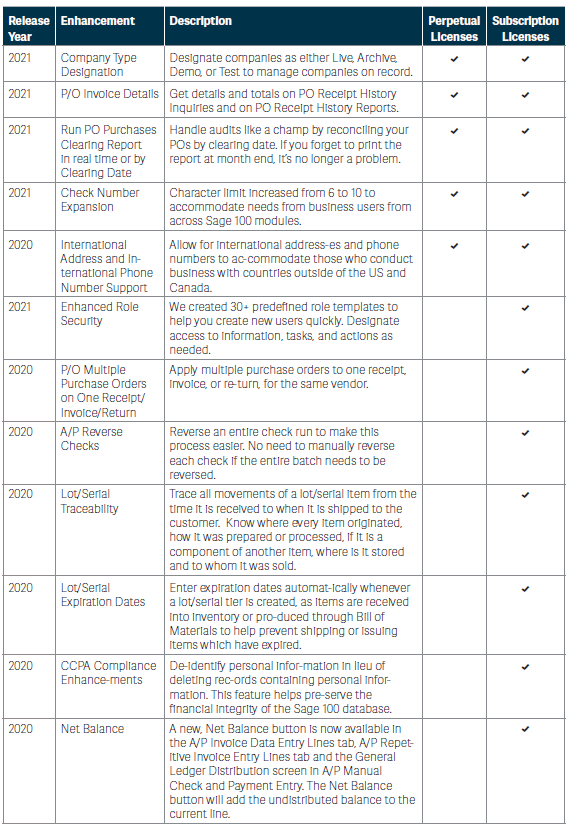 This reference guide highlights the differences in capabilities and the benefits of moving from a perpetual Sage 100 license to a subscription license. Expand your Sage 100 software’s capabilities with new and updated modules designed for subscription license holders.